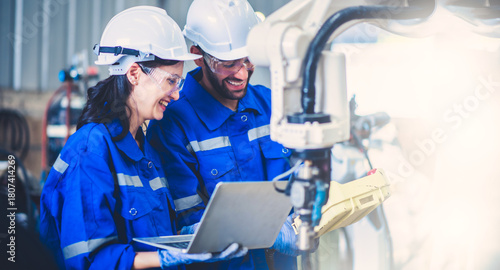 Engineers mechanic using computer controller Robotic arm for welding steel in steel factory workshop. Industry robot programming software for automated manufacturing technology
