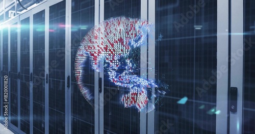 Hovering holographic sphere projecting colored data in cooled data center aisle, with LED lights