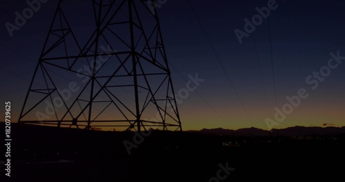 Dominating transmission tower looming left at dusk, sending power lines over ridge and town lights
