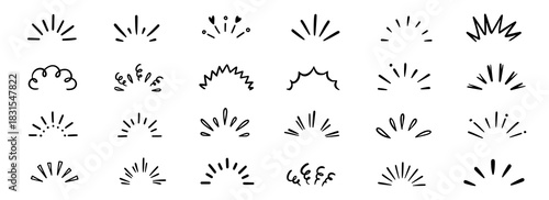 Hand drawn line art bursts with surprise rays and sparkles. Doodle hand drawn starburst icons shine bright. Surprise shapes for comic effects, manga splash, cartoon decorations. Vector illustration
