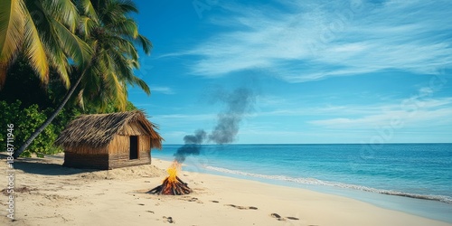 Bonfire burning on idyllic tropical beach with hut and palm trees