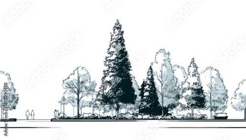 Rysunek szkicowy drzew i zieleni miejskiej na przezroczystym tle, idealny do projektowania krajobrazu.