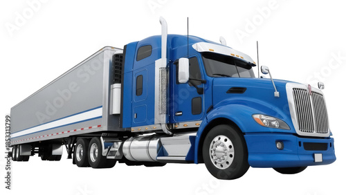 Blue semi-truck with trailer PNG isolated on transparent background, commercial transport vehicle for freight and logistics