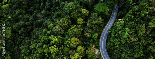 aerial view of a winding asphalt road cutting through dense green forest. Scenic mountain roadway surrounded by lush tropical trees, ideal for travel, transportation, nature, adventure, sustainability