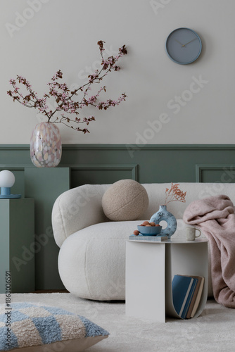 Creative composition of spring living room interior with boucle sofa, stylish coffee table, green stand, glass vase with flowering branches and personal accessories. Home decor. Template.