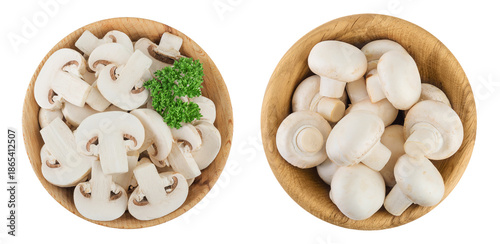 Fresh mushroom champignon slices in a wooden bowl isolated on white background. Top view. Flat lay