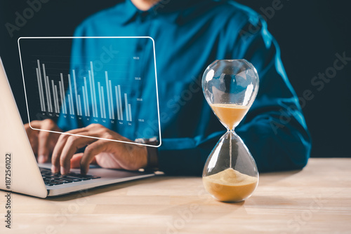 Hourglass time glass hour sand clock concept displays business urgency deadline, person optimizing growth goals on laptop, analyzing data, timer countdown flowing