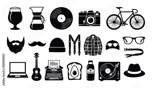 Collection of black and white silhouette icons representing various elements of hipster and indie culture, perfect for lifestyle blogs, event posters, or modern branding projects.
