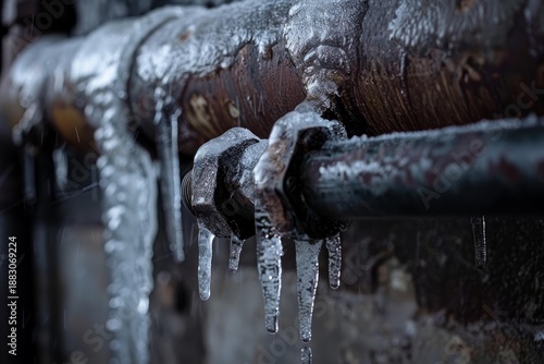 Close up of frozen pipes covered in ice and icicles during a winter storm, highlighting the dangers of extreme cold