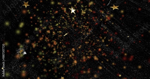 Glittering dense cluster of colorful bokeh lights radiating on black set, with gold star confetti