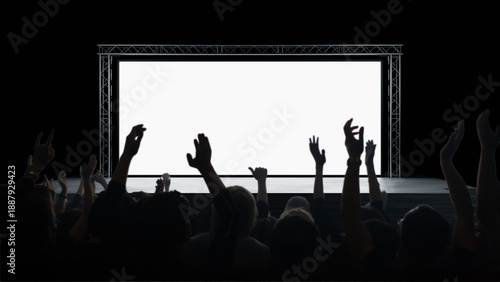 Live event production presents large blank stage screen before audience. Concert staging, media presentation setup, public event organization, entertainment production.