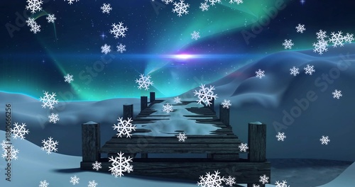 Stretching wooden pier with broken planks and posts over polar plain with aurora and falling flakes