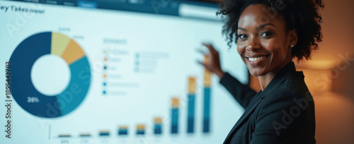 Black woman in suit points to pie chart and bar graph on large screen. She presents business data analysis and key performance indicators, showing company growth.