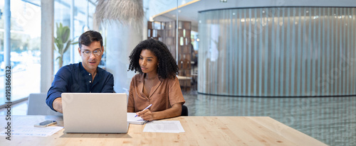 Busy team professional employees working together on computer discussing online technology data at work. Two young diverse coworkers business people using laptop and talking at office meeting.