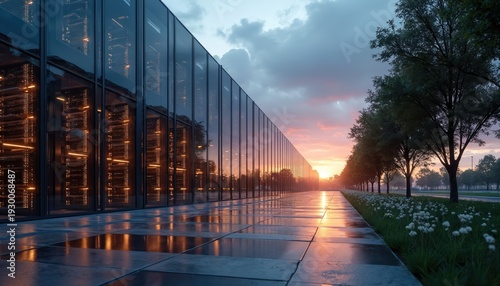 Modern glass building facade with glowing server racks inside. Exterior view of data center at sunset with paved walkway and green lawn. Tech infrastructure with lights reflecting on wet pavement.