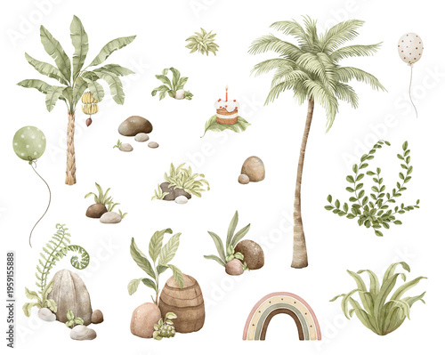 Watercolor set with palm tree, delicate plants, banana palm, cute rainbow, decorative stones and balls. Perfect hand-drawn collection for design childish mural, wallpaper, greeting cards or posters.