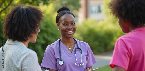 Nurse talks with patients outside. Health worker in scrubs with stethoscope smiles. Woman shares health info during community outreach. Caregiver meets people outdoors.