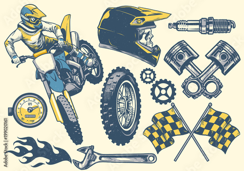 set of motocross objects in retro hand drawing style
