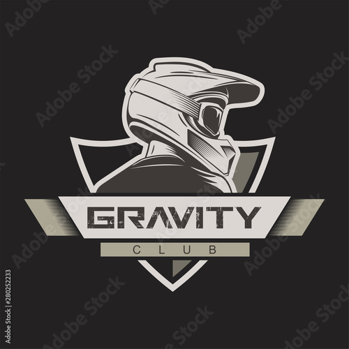 Man with full face motocross helmet. T-shirt print design. Bike school. Bikepark logo. Freeride, downhill mountain biking and motocross design.