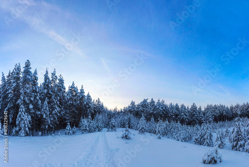Sunset over a snow covered arctic pine forest in a winter wonderland.