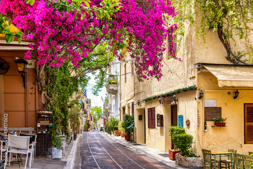 Beautiful view to the little streets of the old town Plaka of Athens, Greece with colorful houses and blooming bougainvillea flowers