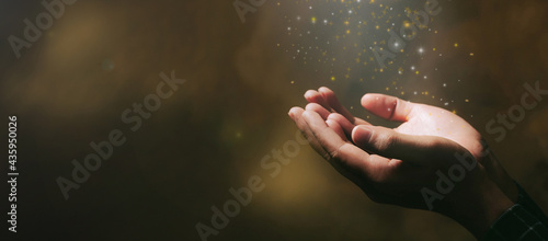 Human hands open palm up worship with faith in religion and belief in God on blessing background.Christian Religion concept background.