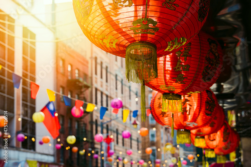 Red chinese lantern in Chinatown in New York city, USA. Festive decoration for Chinese New Year celebration