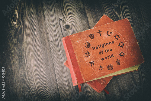 Books of the study of world religions with religious symbols