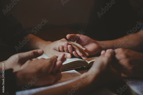 Christian group are praying to god with the bible and sharing the gospel. Concept of faith for god.