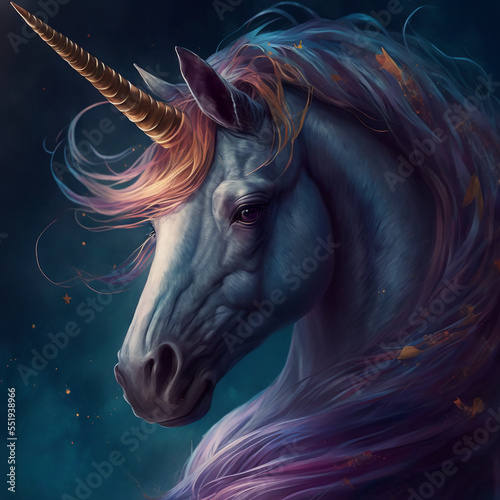 Portrait of a unicorn with purple hair. Spooky fantasy unicorn. Vector illustration. Artwork. Generative AI