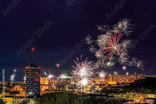 Sylwester, fajerwerki, Nowy Rok, miasto nocą, noc . Gorzów, Polska, zdjęcie