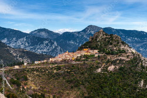 view of the idyllic coastal mountain village of Sainte-Agnes in the Alpes-Maritime region of the Cote d'Azur in southern France