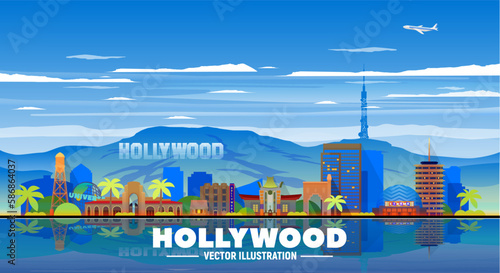 Hollywood LA (Los Angeles) skyline in the sky background. Vector Illustration. Business travel and tourism concept with modern buildings. Image for banner or website.