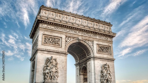Close-up shot of the iconic Arc de Triomphe located in Paris, France