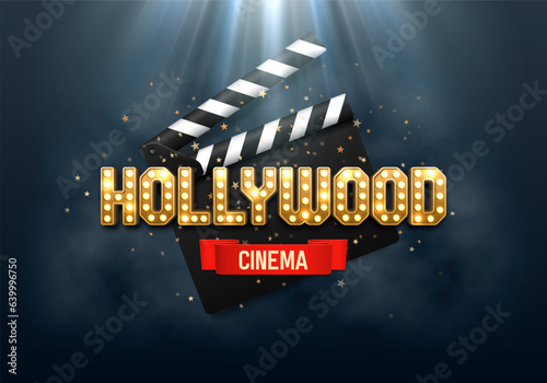 Bright Hollywood sign with a clapperboard. Movie banner or poster in retro style. Vector illustration.