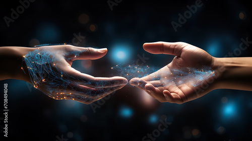 Transferring information from hand to hand. AI (artificial intelligence) meets man. Futuristic data flow technology in cyberspace close-up.