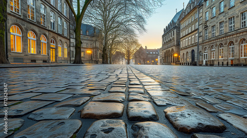 early morning view of a historic street with wet cobblestones, classic architecture, and warm glowing lights from the windows at dawn