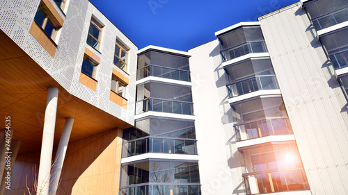 A apartment building with a unique architectural solution. A modern residential building with a white facade and standing on high concrete pillars.
