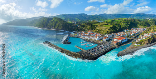 Breathtaking aerial view of Povoação, a picturesque town nestled among green hills on São Miguel island in the Azores.