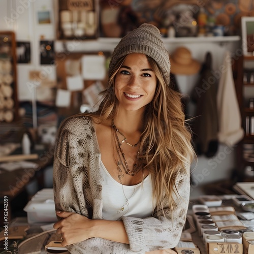 a young woman, likely a small business owner or independent crafter, showcasing her handmade products in a warm