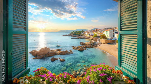 View through an open window with shutters of the sandy beach, rocky coastline and whitewashed mediterranean town