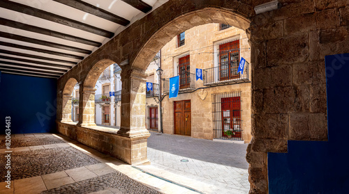 View through stone arches to a traditional old town street in Benissa, Costa Blanca, Spain