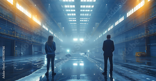 A construction manager meets with professionals in an empty warehouse to discuss the transformation into a chic urban office. Generative AI.