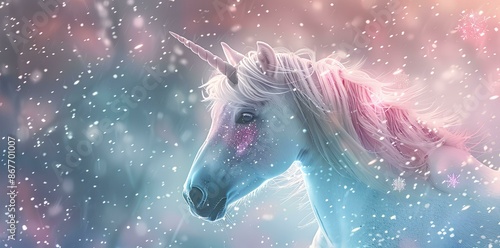 A beautiful unicorn with a pastel pink and blue background, glittering snowflakes in the air, a magical fantasy