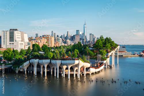 Long exposure of Little Island over the Hudson River in Chelsea, New York, with the lower Manhattan skyline as a stunning backdrop at dusk.