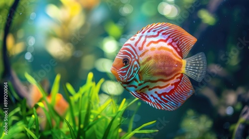 A beautiful discus fish swimming among aquatic plants.