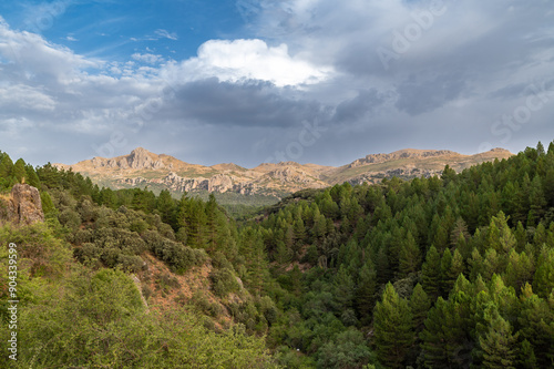 Panoramic view of the Sierra de Huétor natural park (Granada, Spain), with high mountains among pine forests, on a summer morning