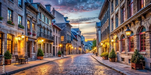 Charming old town Montreal with famous cobbled streets illuminated at twilight