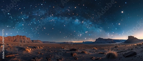 Panoramic view of a starry night sky over a desert landscape with rock formations and scattered vegetation, showcasing the beauty of the Milky Way.