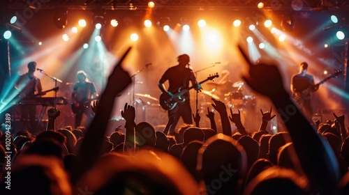 Indie Band Concert, vibrant colors, dynamic lighting, energetic crowd, photography